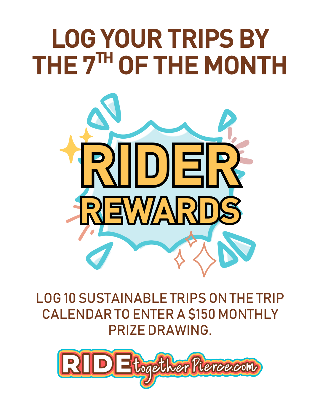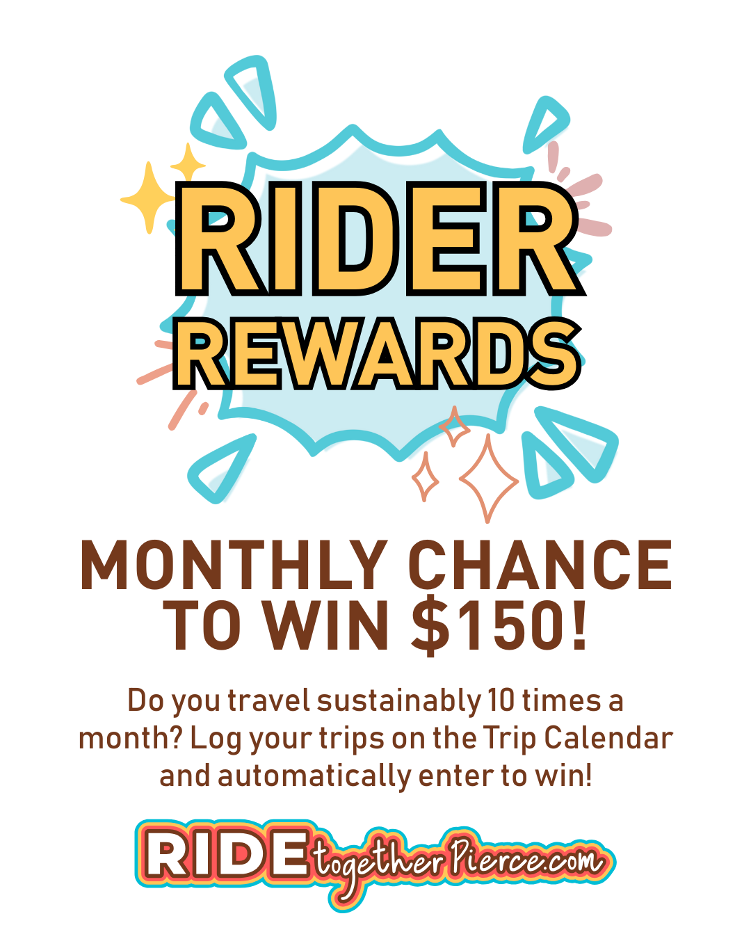 Ride Together Pierce is proud to present a new monthly rewards program: Rider Rewards! This program will reward one lucky sustainable traveler with $150 each month* in 2026!